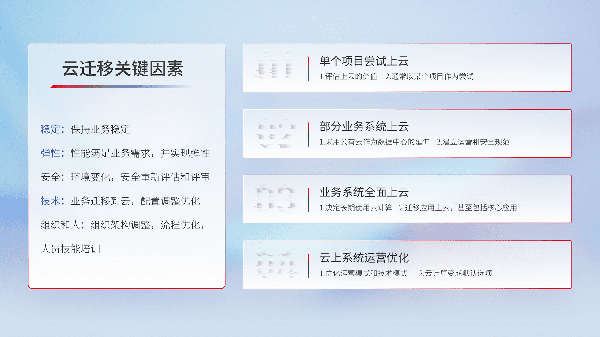 结合实际业务,,,,从规划设计、、、、云平台选型、、、云原生改造、、、、数据迁移、、集成交付,,,,迁移全过程为客户识别最佳上云路径,,做好风险识别管理,,,设计网络架构、、、、身份权限、、、、安全审计合规、、、操作审计、、、、日志审计、、、、监控告警策略、、、、多站点容灾设计等,,,,对云上基础设施进行整体规划,,,提升IT治理水平,,,,以满足弹性、、、高可用、、、高性能的需求。。。。