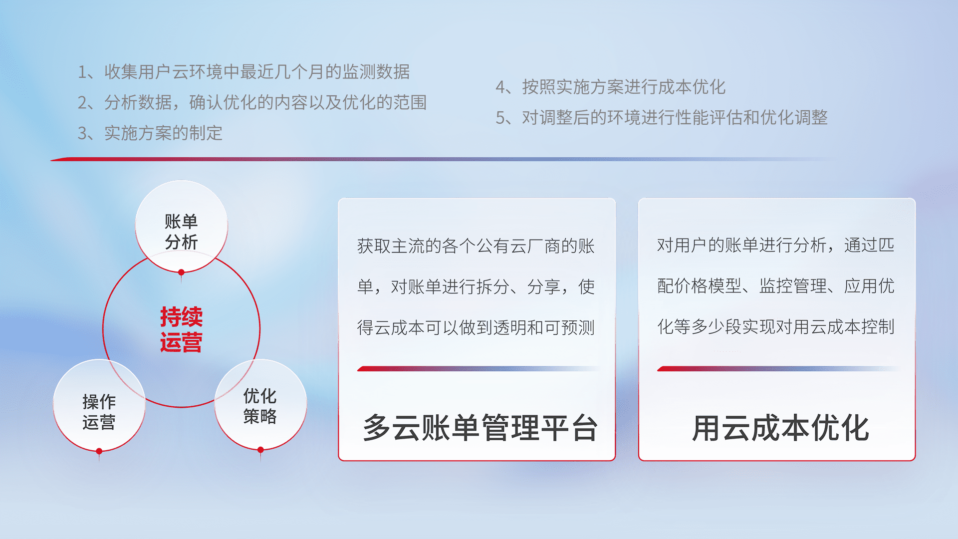 通过多云纳管,,以统一的资源数据模型把客户的云资源进行抽象和封装,,,进而实现对多云资源的统一操作,,,保障云资源管理的可靠性、、稳定性与可用性。。量身定制化运维内容,,,,配置、、、开发运维、、、、补丁管理、、、备份、、、、监控、、、、认证和访问管理、、、审计和日常巡检等,,,,保障在用云过程中的可靠度,,,稳定度以及高可用率。。。