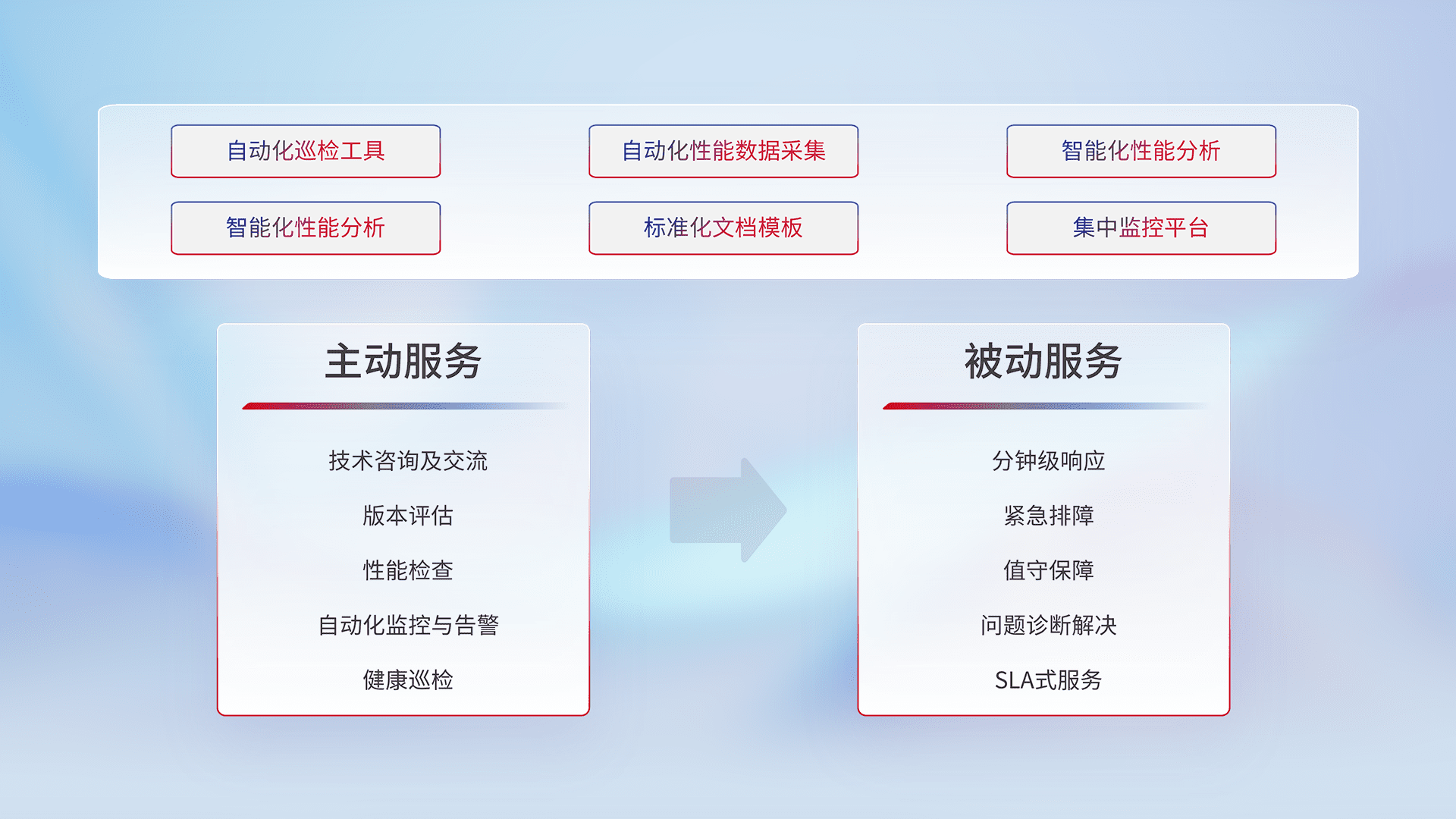智能化工具和标准化文档,,保障服务质量,,,,提供主动服务(包含技术咨询、、、、版本评估、、、、性能检查、、、自动化监控与告警、、、、健康巡检)和被动服务包含(分钟级响应、、紧急排障、、、、值守保障、、、问题诊断解决、、SLA服务)。。。