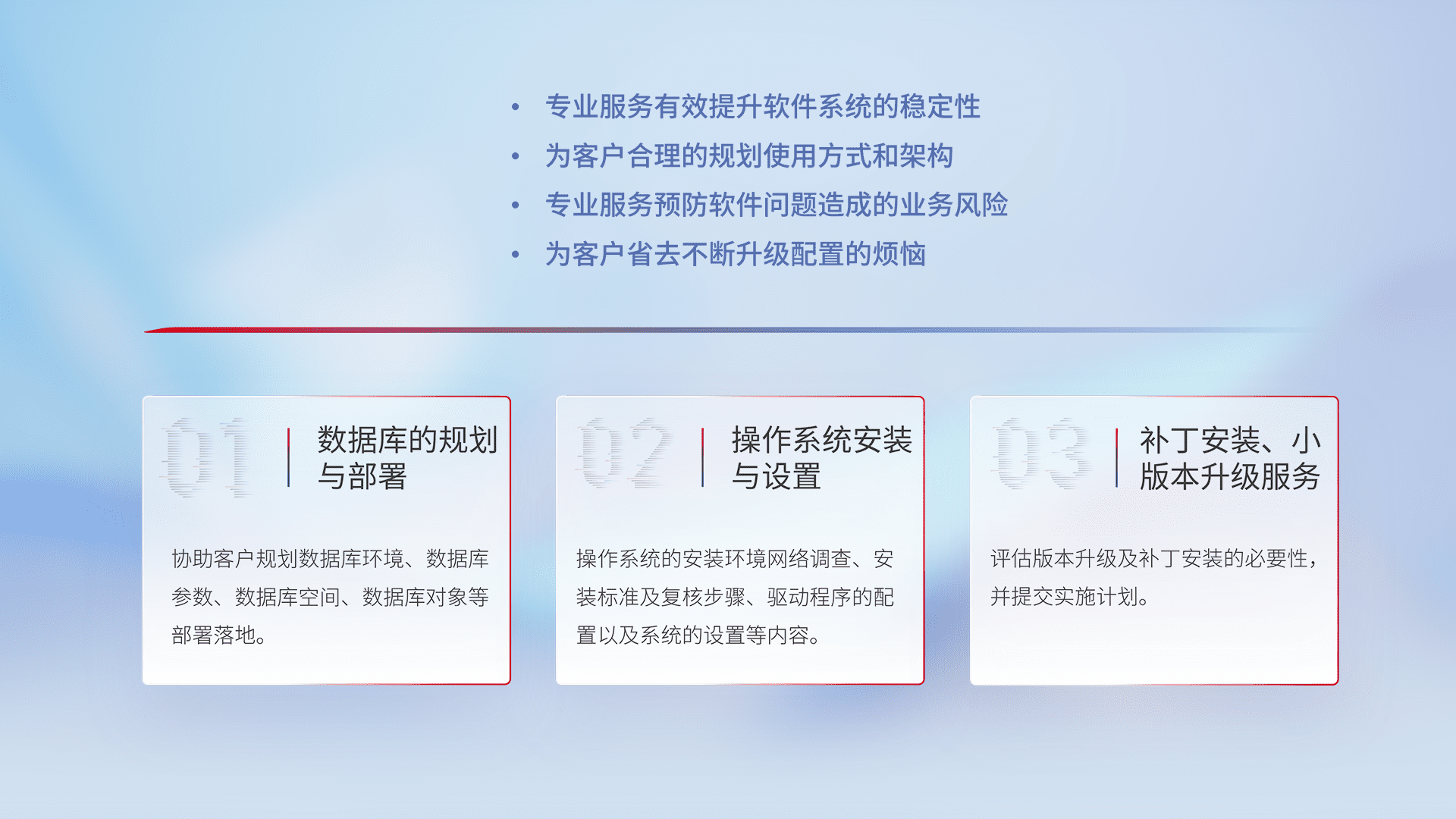 为客户提供软件规模升级、、、快速部署、、、、按需配置的专业服务,,,从数据库的规划与部署到操作系统的安装与设置,,,,再到补丁安装和小版本升级提供支持。。