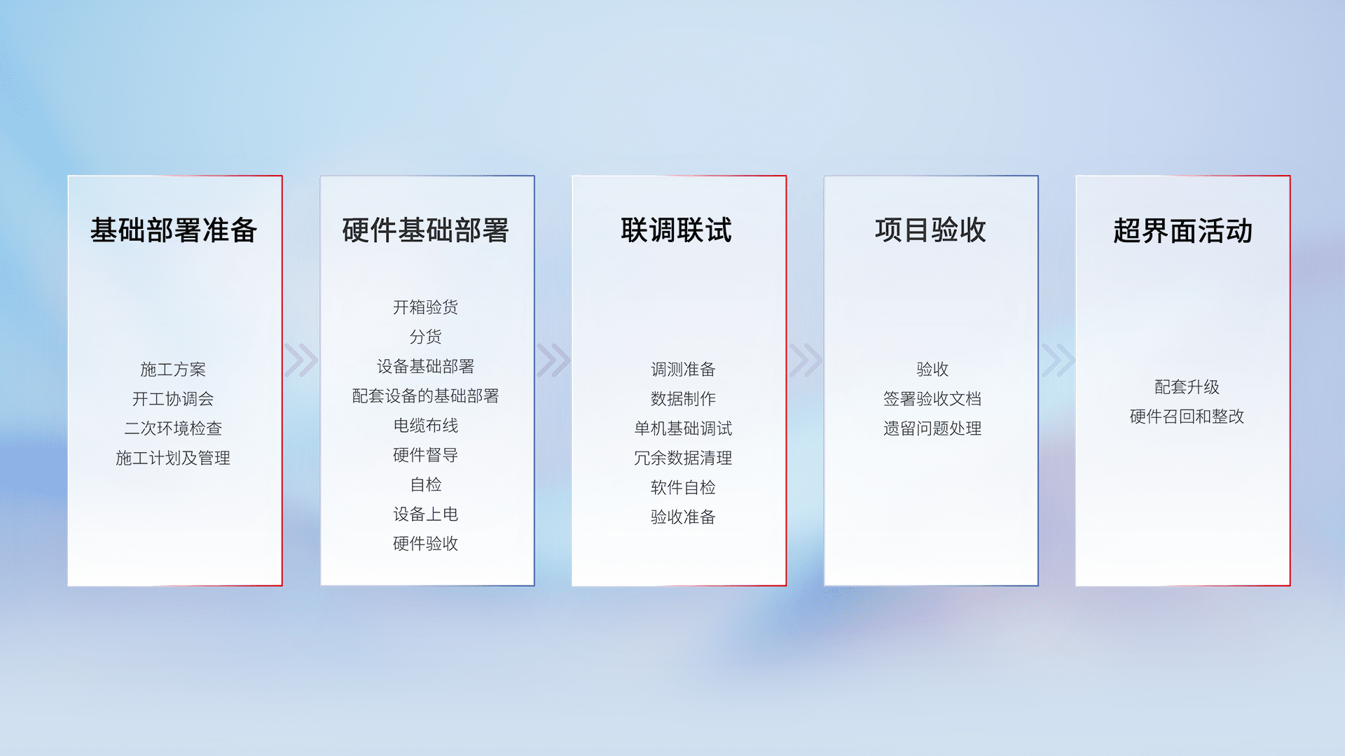 从基础部署准备、、、、硬件基础部署、、、联调联试、、项目验收、、、越界面活动的全过程可追溯,,,保证施工质量和进度。。