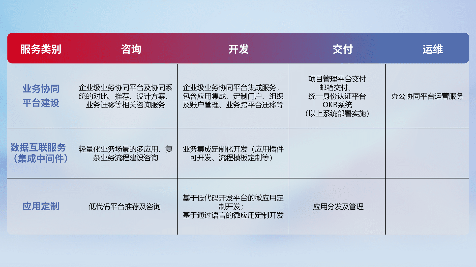 针对钉钉、、、、企微、、IDaas等平台级产品提供产品的规划、、、方案、、、、交付、、、、定制化开发等服务,,实现如统一协同办公、、、智能客户服务、、混合会议管理、、、智能数据查询、、等业务场景,,,实现数字化转型。。。。